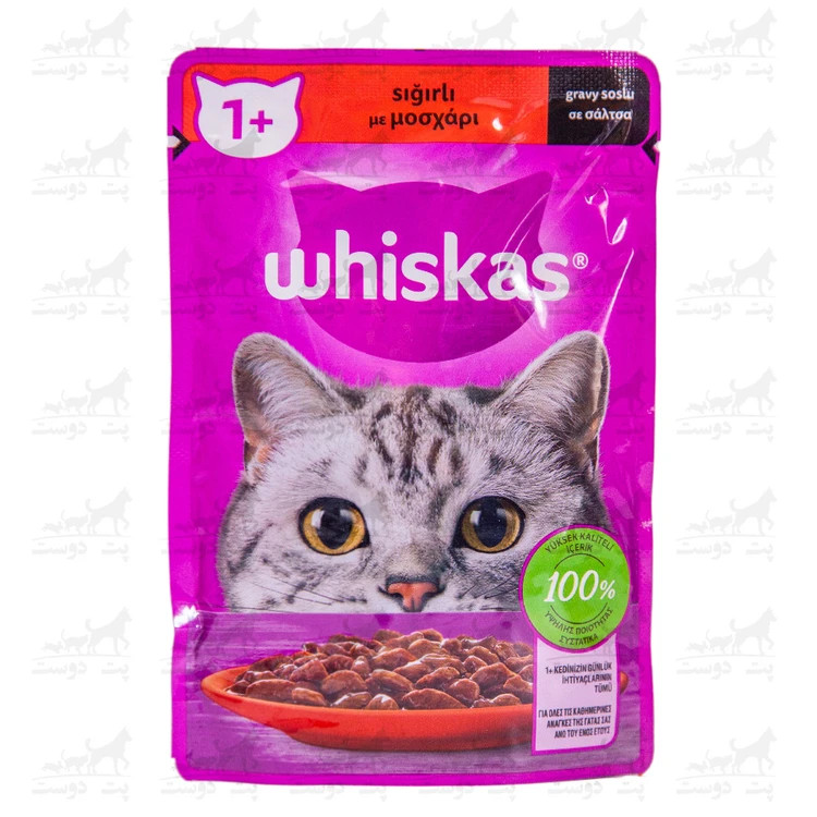 پوچ گربه با طعم گوشت ویسکاس حاوی ترکیبی از گوشت ها از جمله گوشت بره است.
